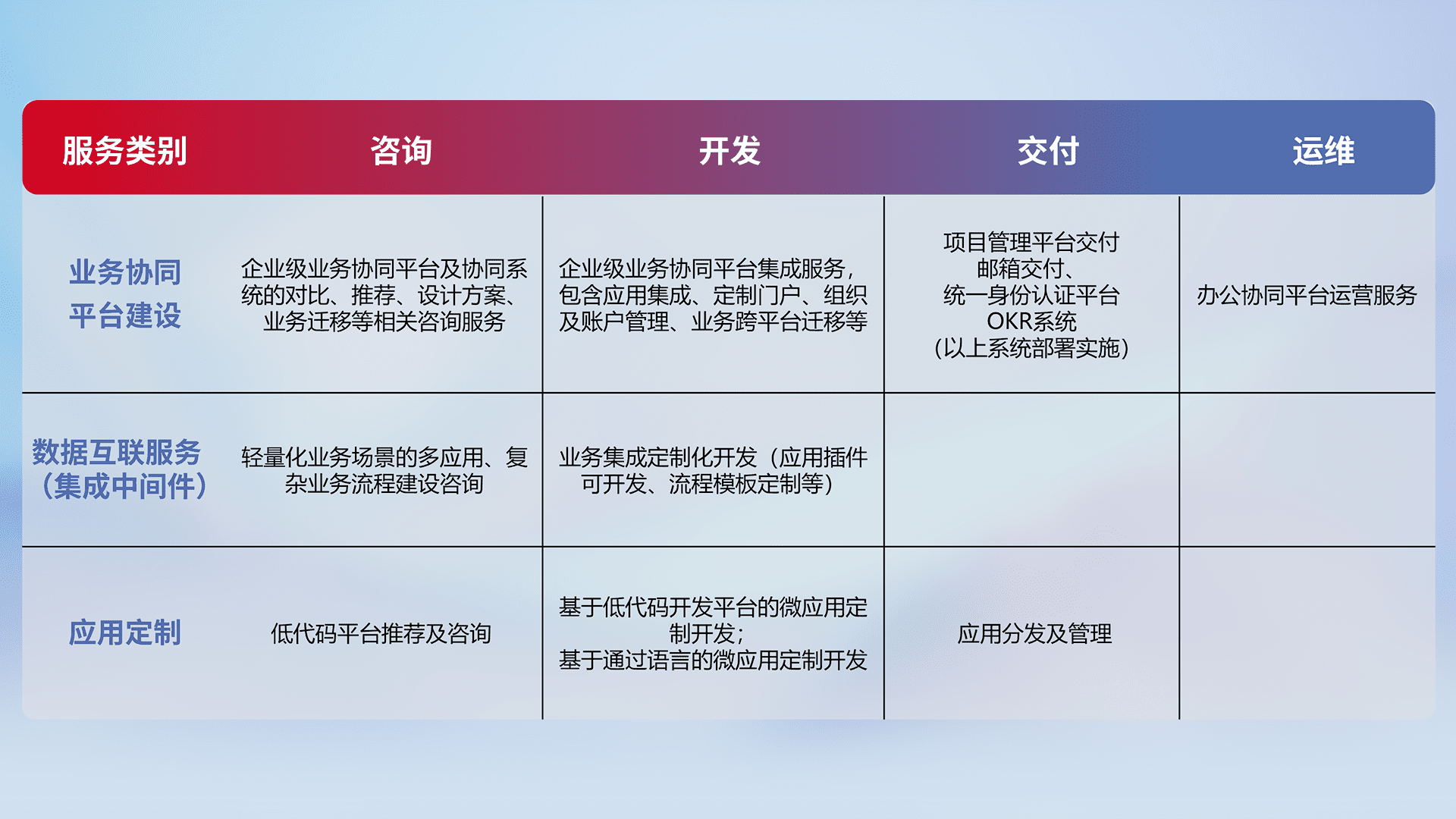 针对钉钉、、、企微、、IDaas等平台级产品提供产品的规划、、、方案、、、交付、、、定制化开发等服务,,实现如统一协同办公、、、、智能客户服务、、混合会议管理、、、、智能数据查询、、、等业务场景,,,,实现数字化转型。。