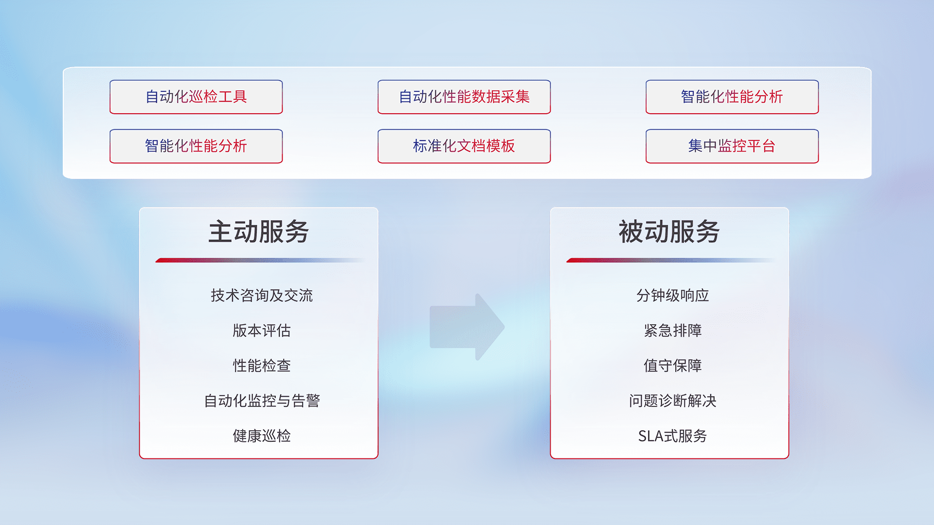 智能化工具和标准化文档,,保障服务质量,,,提供主动服务(包含技术咨询、、、版本评估、、性能检查、、自动化监控与告警、、健康巡检)和被动服务包含(分钟级响应、、、、紧急排障、、、值守保障、、问题诊断解决、、SLA服务)。。